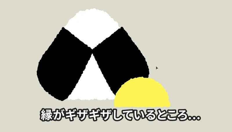 これがベースのおにぎりの形になります。あとは、三角形の角を丸くしていくとおにぎりの形に見えてくるんですが…、私はもうこの時点で許せません。 直線がまっすぐ過ぎて、機械が握ったみたいです。やっぱり真心を込めた手作りのおにぎりにしたい!なので、もう少しいびつさを足していきます。