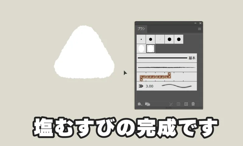 ここで、満を持して登場するのが先ほど作ったつぶつぶブラシ!これを線に設定すると…美味しそうなIllustratorでアナログ風塩むすびの完成です!